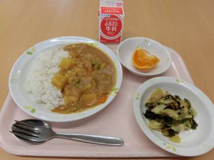 今日の献立は、カレーライス、胡麻サラダ、くだもの、牛乳です。