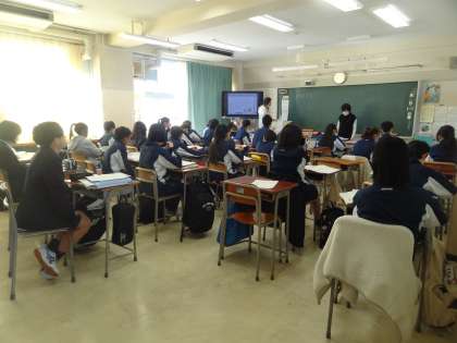 今日の1校時の1年生の授業は、数学、英語(写真付き)です。2年生は、神経系(理科)、社会(写真付き)、国語です。