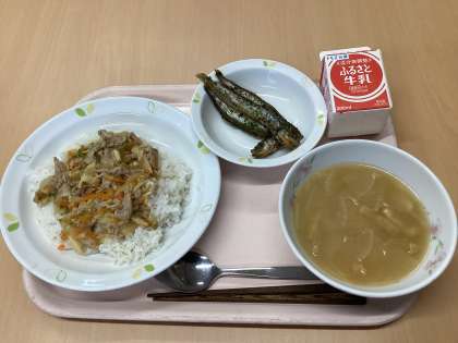 今日の献立は、スタミナ丼、ししゃものから揚げ、みそ汁、牛乳です。