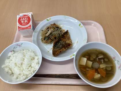 今日の献立は、ごはん、ほっけのあずま煮、小松菜と春雨のサラダ、けんちん汁、牛乳です。今日が今年度最後の給食でした。1年間の給食の振り返りもしてくださいね。