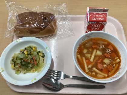 令和6年度の給食が今日から始まりました。本日の献立は、ダイスチーズパン、ひよこ豆入りミネストローネ、ツナサラダ、牛乳です。