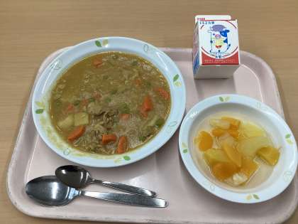 本日の給食につきましては、ごはんの提供ができなくなりました。ご迷惑をおかけしますが、ご理解とご協力のほどよろしくお願いします。今日の献立は、カレールー、フルーツポンチ、牛乳です。午後の対応につきましては、すぐーるを確認してください。