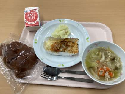 今日の献立は、ココアパン、魚のピザ焼き、クリームポテト、いなか風豆スープ、牛乳です。