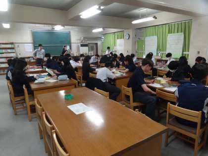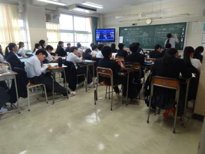 5校時の1年生の授業は、ガイダンス(技術)、国語、素数とは(数学・写真付き)です。2年生は、中世のヨーロッパとイスラムの世界の特色とは(社会)、保健体育(写真付き)、理科です。3年生は、図書室を知ろう(国語・写真付き)、美術、短距離走(保健体育)です。