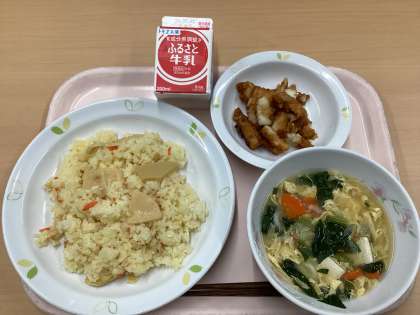 今日の献立は、たけのこごはん、いかのかりん揚げ、かきたま汁、牛乳です。