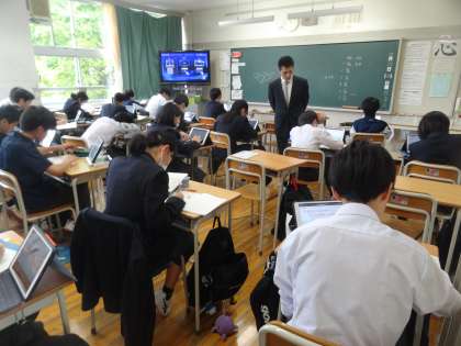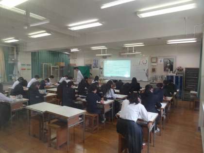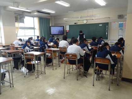 3校時の1年生の授業は、動物(理科)、英語(写真付き)です。2年生は、数学(写真付き)、手を描く(美術・写真付き)です。