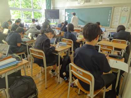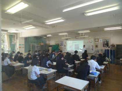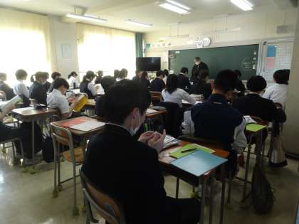 1校時の2年生の授業は、数学(写真付き)、音楽、ヨーロッパ人との出会い(社会)です。3年生は、英語、文化財保護法(美術・写真付き)、力の合成と分解(理科・写真付き)です。