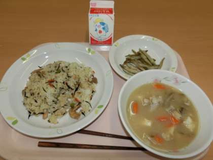 今日の献立は、大豆入りひじきごはん、小魚のから揚げ、さつま汁、牛乳です。