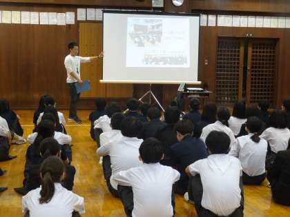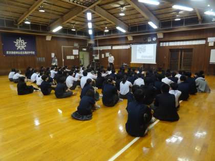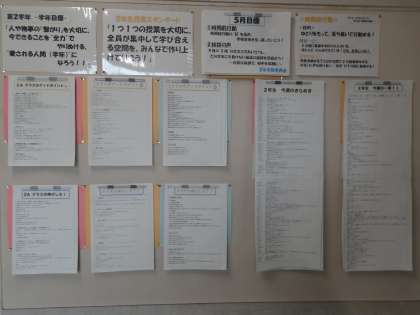 連休が明けました。2年生は格技室で学年朝礼を行いました。4月の全校朝礼では開始前にきれいに整列していた、というお話をしていました。すばらしいことですね。いいことは今後とも続けていきましょう。3階の美術室横の廊下の壁に目標等が掲示あります。5月も頑張っていきましょう。