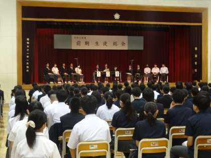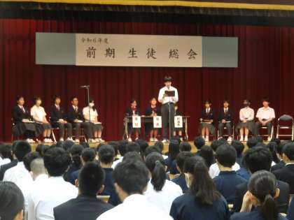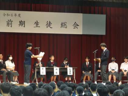 生徒総会とは、私たち生徒の代表である委員会が提案したことを生徒全員で決定し、実行に移していく上で、とても重要な会議です。私語を慎み、積極的に参加し、これからの駒沢中をよりよくしていきましょう(開会のことばから抜粋)。生徒会長と各委員会委員長からの提案、質疑応答の後、活動方針案が承認されました。