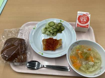 今日の献立は、ココアパン、いかのチリソースがけ、オニオンサラダ、野菜スープ、牛乳です。