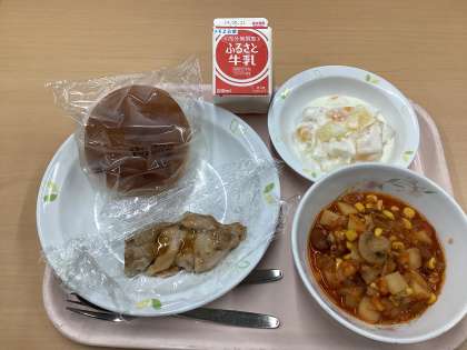 今日の献立は、セルフ照り焼きチキンバーガー、チリコンカン、フルーツのヨーグルトがけ、牛乳です。