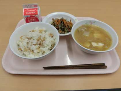 今日の献立は、こぎつねごはん、小松菜と春雨のサラダ、豚汁、牛乳です。