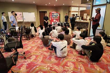 会場の関係で、各班の班長がだいひょうして、到着式をロビーで行いました。