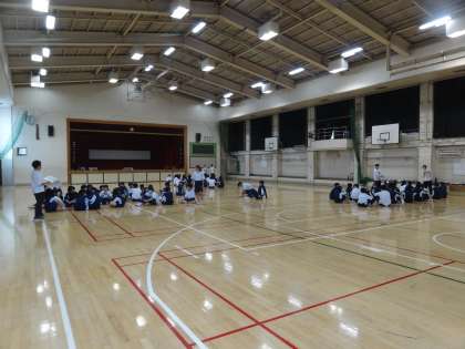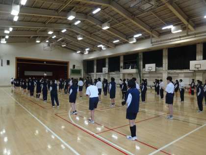 運動会の学年練習を体育館で行っています。運動会に向けての話の後、ラジオ体操、全員リレーの並び順の確認をしています。