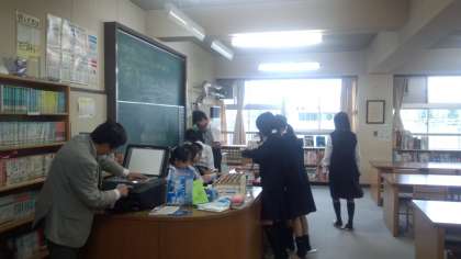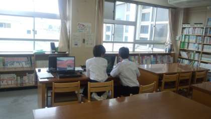 いつもは校庭や中庭に元気な声がしますが、今日は雨、図書室をのぞいてみました。落ち着いた雰囲気で、本を読むことができています。PCで検索をすることもできます。写真はカウンターの様子とPC検索です。生徒のみなさん、大いに図書室を活用しましょう。