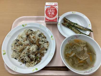 今日の献立は、大豆入りひじきごはん、ししゃものから揚げ、沢煮碗、牛乳です。