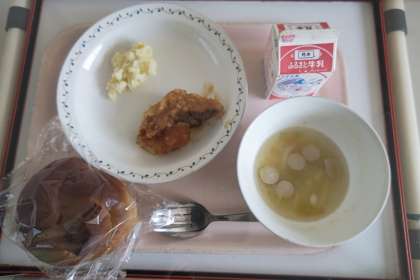 今日の献立は、黒砂糖パン、メルルーサのバーベキューソース、マッシュポテト、ウインナーとキャベツのスープ、牛乳です。