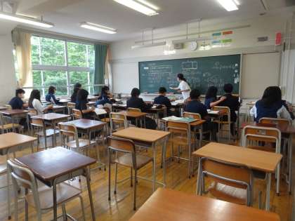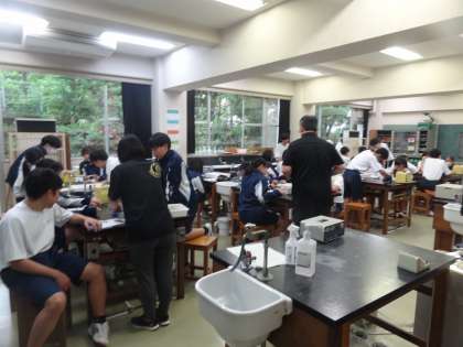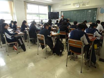 3校時の1年生の授業は、英語、シンシュン(国語・写真付き)、分配法則(数学・写真付き)です。2年生は、直列回路と並列回路(理科・写真付き)、保健体育、綱吉の時代(社会)です。3年生は運動会練習です。