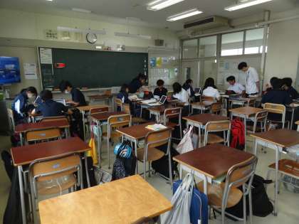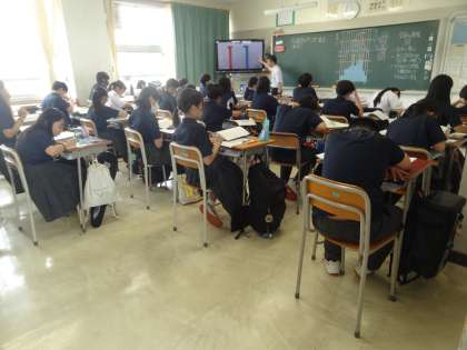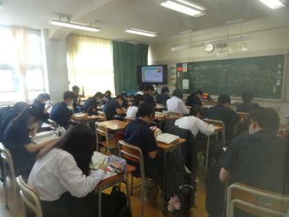 5校時の授業は、運動やスポーツへのかかわり方(保健体育・写真付き)、雨温図の作り方・見方(社会・写真付き)、脊椎動物(理科)です。2年生は、国語、天保期の内憂外患とそれに対する改革について理解しよう(社会・写真付き)、数学(写真付き)です。