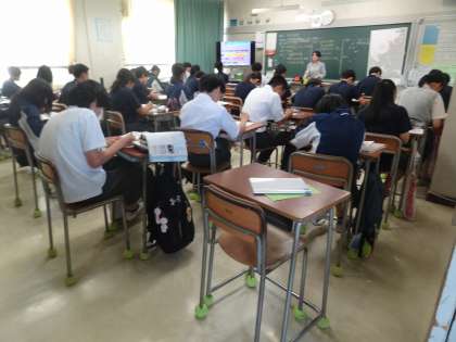 3校時の2年生の授業は、無酸素運動(保健体育)、家庭科、クマゼミ増加の原因を探る(国語)です。3年生は、体力測定(保健体育・写真付き)、生物の進化と環境(理科)、太平洋戦争開戦の背景を理解しよう(社会・写真付き)です。