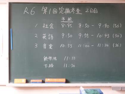 おはようございます。1学期の期末考査です。今日の科目は、社会(50分)、英語(50分)、音楽(30分)です。今日も給食の提供はありません。下校時刻は11:50です。期末考査頑張りましょう。