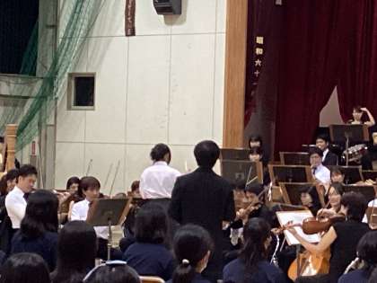 後半は、「アトム・ハーツ・クラブ組曲第1番」から第1楽章、オーケストラによる校歌合唱、「カルメン」前奏曲での指揮者体験コーナー(写真付き)、管弦楽のためのラプソティを演奏していただきました。オーケストラの演奏で校歌を歌うのは初めての経験だったと思います。また、各学年からの代表者による指揮者体験も盛り上がりました。サプライズであの先生も指揮者にチャレンジしました。オーケストラを聴き、豊かな感性が広がれば幸いです。東京交響楽団の皆様、ありがとうございました。