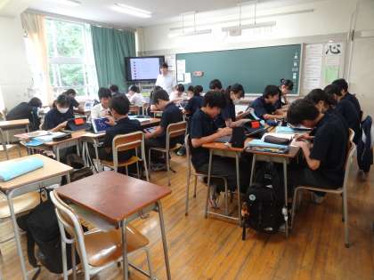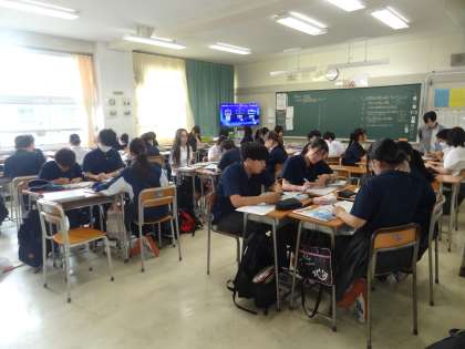 1校時の1年生の授業は、英語、第三角法(技術・写真付き)、1次式の加法・減法の計算ができる(数学)です。2年生は、国語(写真付き)、音楽、地形図(社会・写真付き)です。