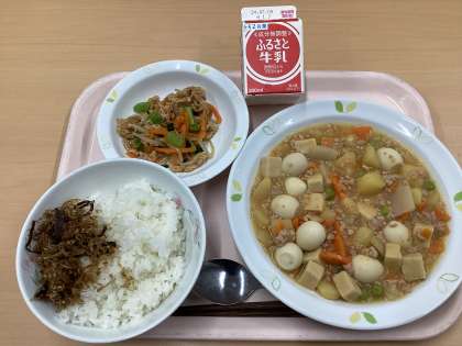 今日の献立は、麦入りごはん、カミカミ佃煮、じゃがいものそぼろ煮、からし和え、牛乳です。