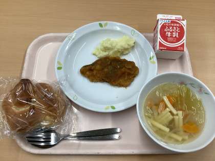 今日の献立は、パインパン、魚のバーベキューソース、クリームポテト、マカロニスープ、牛乳です。