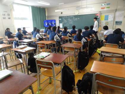 4校時の1年生の授業は、家庭科、理科です。2年生は、理科、英語(写真付き)、プール(写真付き)です。3年生は日本国憲法(社会)、平方根のいろいろな問題を解く(数学・写真付き)、保健体育です。