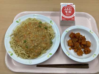 今日の献立は、肉みそめん、カルシウムビーンズ、牛乳です。