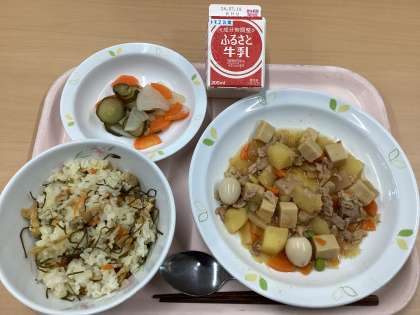 今日の献立は、昆布ごはん、肉じゃがうま煮、きゅうりと大根の甘酢和え、牛乳です。
