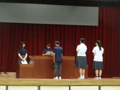 今日の生徒会朝礼では、各委員会委員長からの報告、生徒会長からの話の他に、あいさつプロジェクトの表彰がありました。