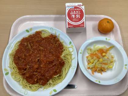 今日の献立は、スパゲッティミートソース、コーンサラダ、みかん、牛乳です。