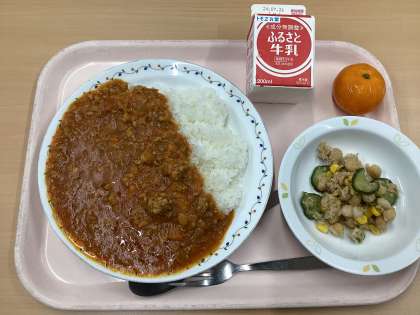 今日の献立は、夏野菜のキーマカレー、ビーンズサラダ、みかん、牛乳です。