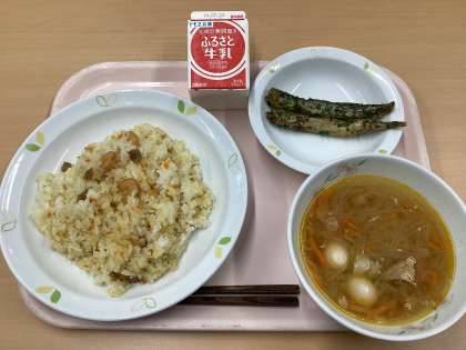 今日の献立は、チャーハン、ししゃものから揚げ、ピリ辛みそスープ、牛乳です。本日で1学期の給食の提供は終了です。今学期の途中、ご飯の提供ができませんでした。申し訳ございません。2学期もよろしくお願いします。