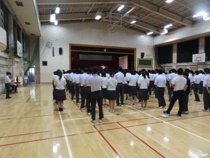2学期が始まりました。校長の話の後、校歌を歌いました。始業式後、吹奏楽部、陸上部、卓球部の表彰を行い、最後に生活指導主任の先生の話を聞きました。まだ暑い日が続きますが、頑張っていきましょう!