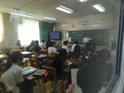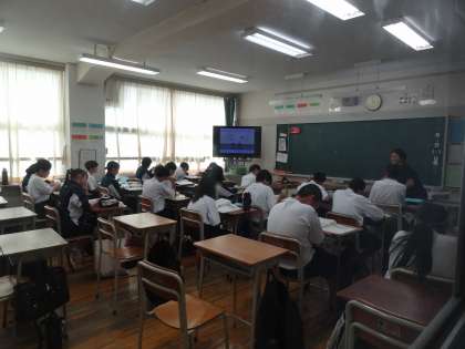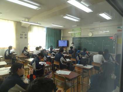 3校時の1年生の授業は、英語(写真付き)、グラフの書き方(理科)です。3年生は、解の公式(数学・写真付き)、日本の高度経済成長(社会・写真付き)です。