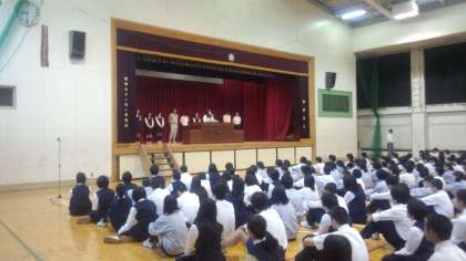今日は生徒朝礼の日です。各委員長から、これまでの取り組みの内容や反省、生徒の皆さんへのお願いなどが話されました。生徒総会で承認されたことを、どの委員会も着実に進めています。朝礼のあと、生徒会担当の先生方と一緒に反省の会をしている本部役員と各委員長の真剣な表情が印象に残りました。みんなでがんばってくれています。