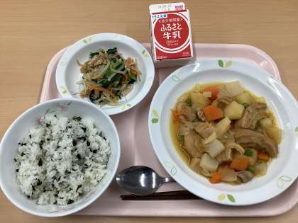 今日の献立は、わかめごはん、肉じゃがうま煮、おひたし、牛乳です。