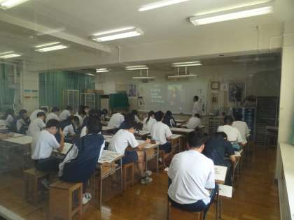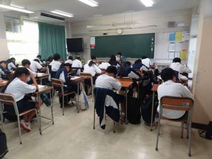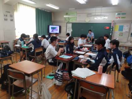 5校時の1年生の授業は、習字、水泳、数学(写真付き)です。3年生は、国語、英語(写真付き)、美術(写真付き)です。