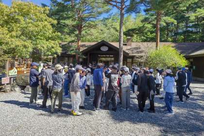 河口湖フィールドセンターに到着しました。これから胎内樹形散策とクラフト体験を行います。