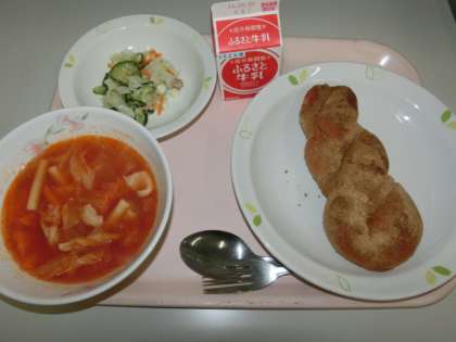 今日の献立は、きな粉揚げパン、ミネストローネ、チーズサラダ、牛乳です。