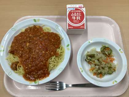 今日の献立は、スパゲッティ大豆入りミートソース、ツナサラダ、牛乳です。