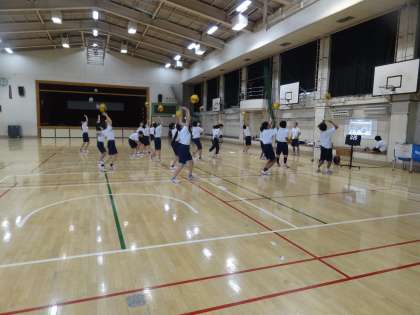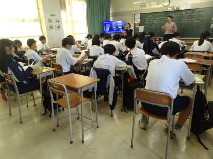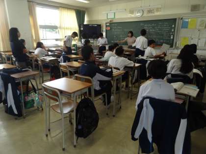 5校時の1年生の授業は、家庭科、数学(写真付き)、バレーボール(保健体育・写真付き)です。2年生は、英語(写真付き)、同じ訓、同じ音をもつ漢字(国語)です。3年生は、国語、理科、環境権(社会)です。