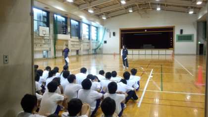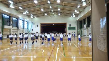 保健体育の時間、運動会の練習をしています。運動会は雨で順延されましたが、体育館でみんな元気に練習しています。左の写真は2年生、右の写真は1年生です。