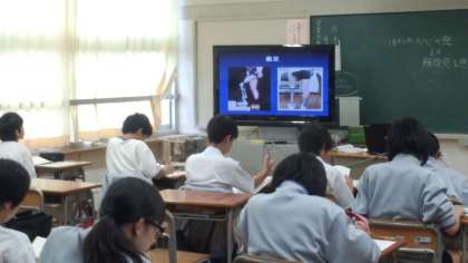 1年生の教科「日本語」の授業を参観しました。「哲学」の授業を4クラスで進めていました。左の写真は「ショートパンツ初体験 イン アメリカ」という文章をもとに、ICTを効果的に使って考えを深めています。特に、作者のウェブサイトにLANでつないで、リアルタイムで画面を確認したり、義足の写真を画面に大きく写したりして、みんな驚きとともに関心をもって取り組めていました。