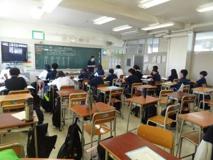 5校時の1年生の授業は、家庭科、2つの数量の関係を表す数(数学・写真付き)、バレーボール(保健体育・写真付き)です。2年生は、英語、国語です。3年生は、国語、理科、社会です。