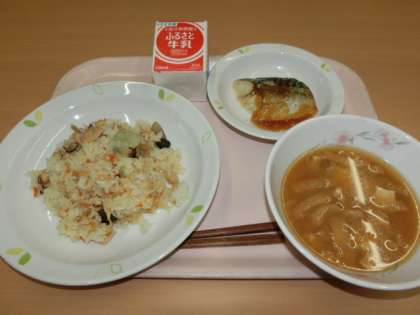 今日の献立は、秋の香りごはん、鯖のおろしソースがけ、みそ汁、牛乳です。